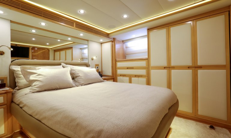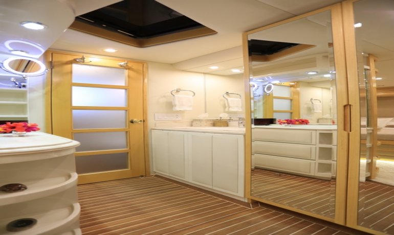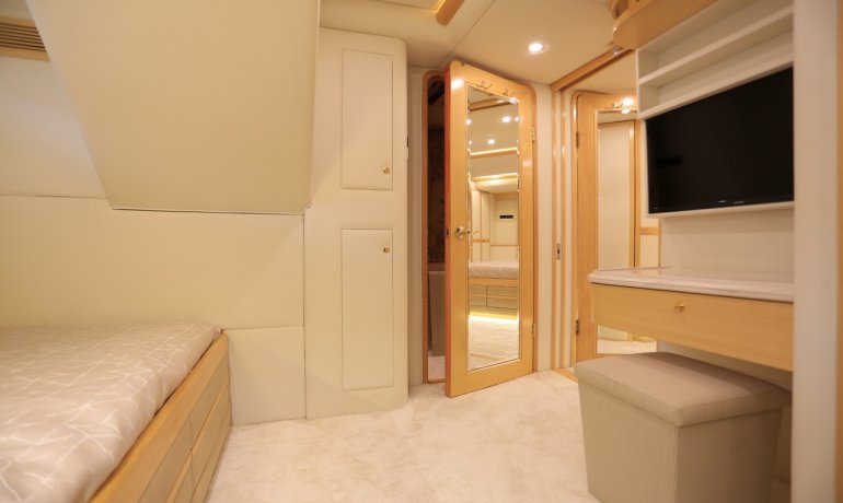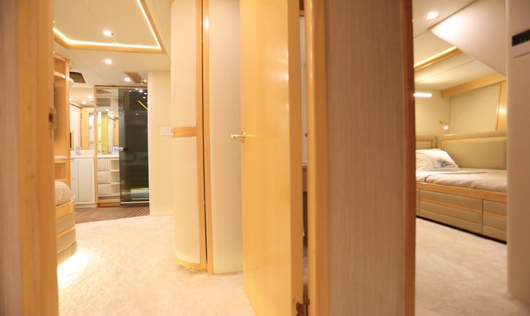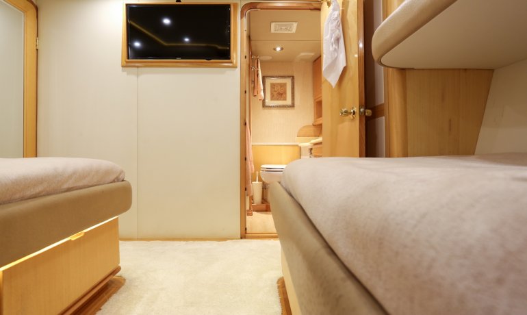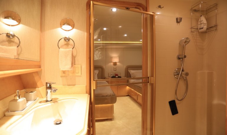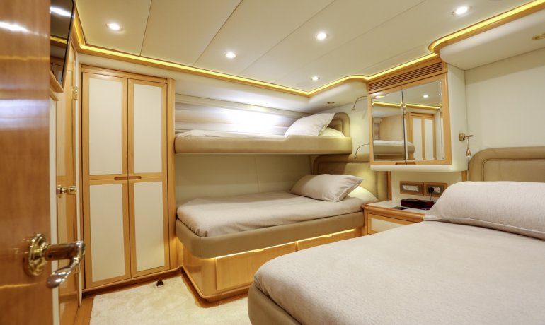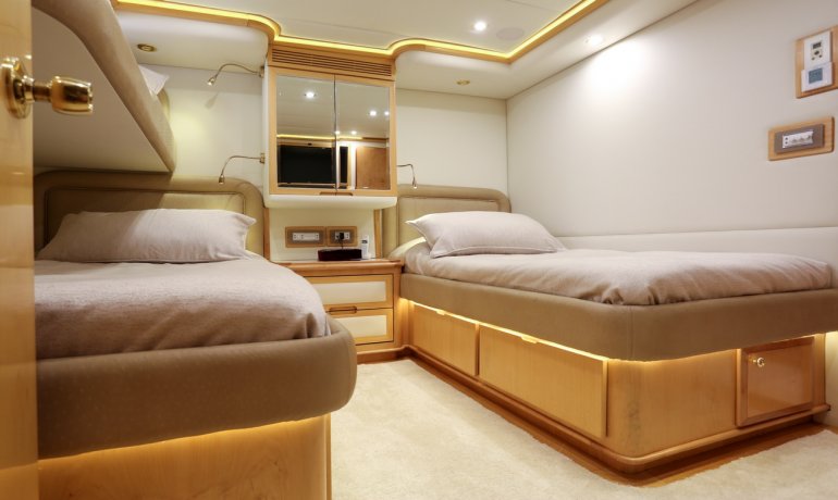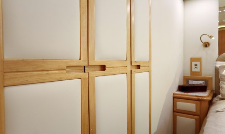Full beam midship. Can be used as either a suite with king size bedroom with two separate en-suite facilities including steam room shower and separate communicating living room with sofa and desk or two separate cabins with separate entrances and en-suite facilities by conversion of sofa to either a single bed that can also slide to convert to a double bed.