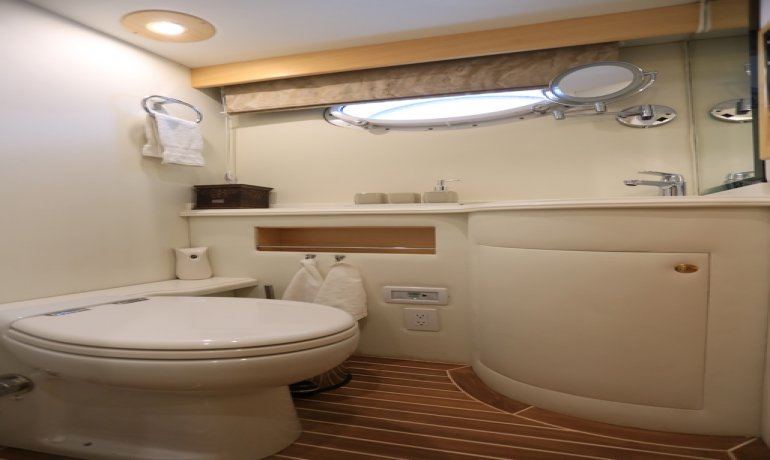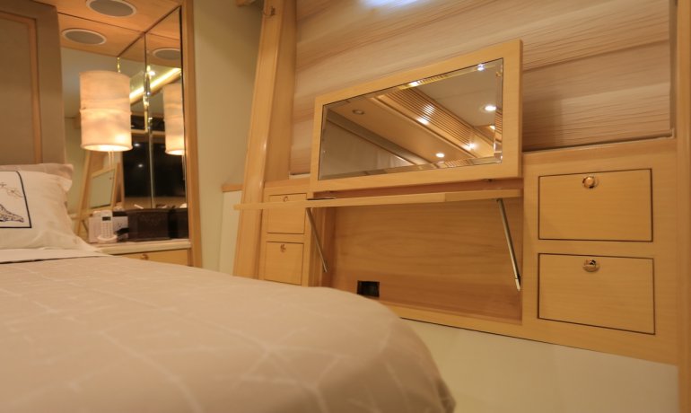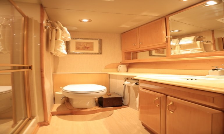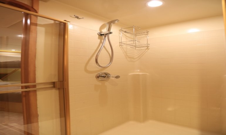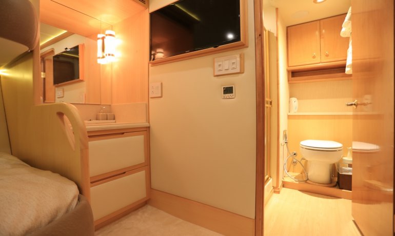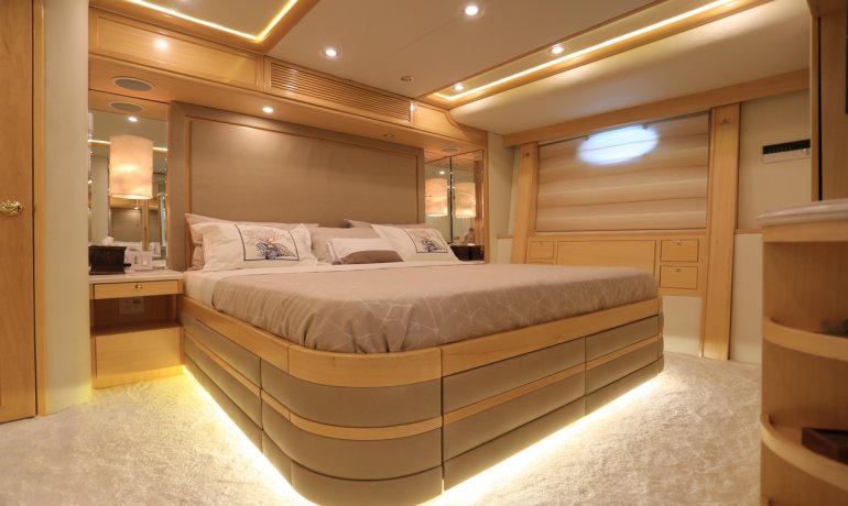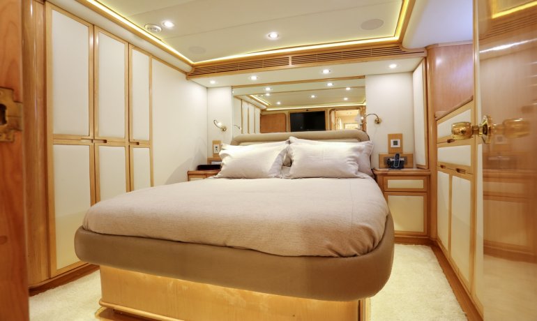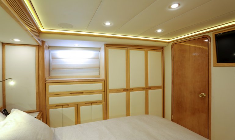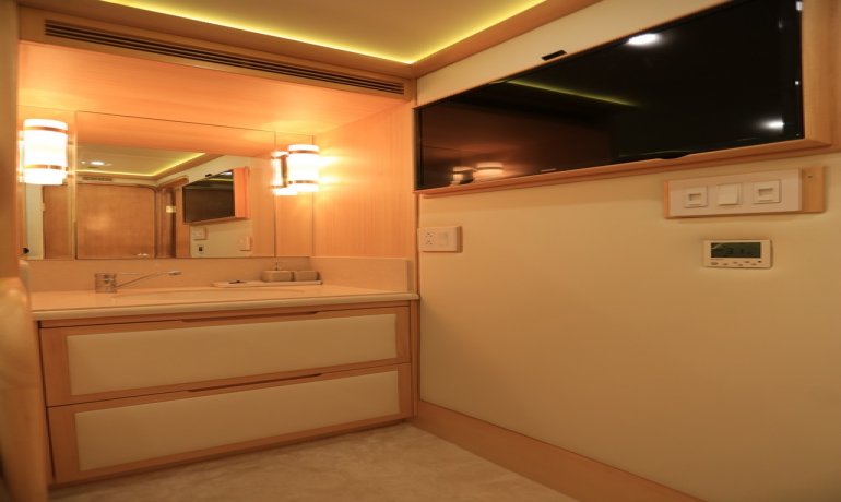 Full beam midship. Can be used as either a suite with king size bedroom with two separate en-suite facilities including steam room shower and separate communicating living room with sofa and desk or two separate cabins with separate entrances and en-suite facilities by conversion of sofa to either a single bed that can also slide to convert to a double bed.