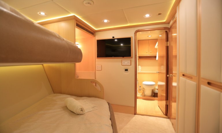All four beds in the two forward cabins can be used as either single beds or slide to convert to double beds.